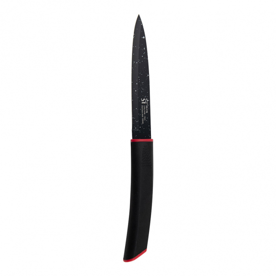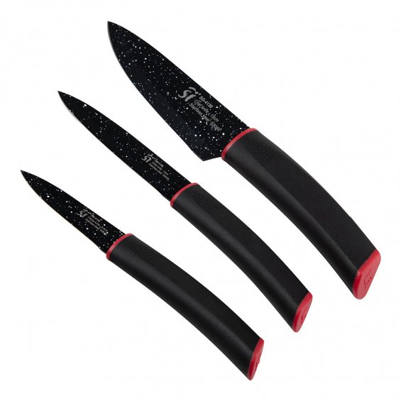 Juego de 3 cuchillos acero inoxidable con revestimiento de mármol 1 cuchillo de chef 29,5 x 4,5 x 2,6 cm 1 cuchillo multiusos 25 x 2,5 x 2 cm. 1 cuchillo de pelar 21,5 x 2,5 x 2,0 cm mango negro inserto de color rojo