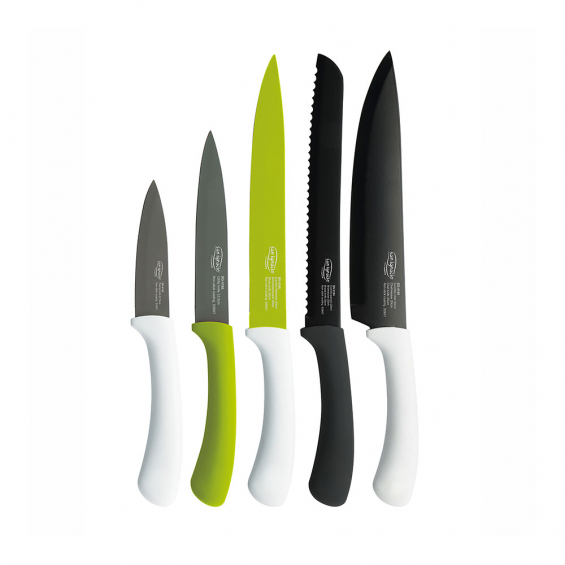 Set 5 unid. cuchillos acer.inox. green sg4165 san ignacio. longitudes y diámetros variados. el set de cuchillos incluye un cuchillo pelador, un cuchillo multiusos, un cuchillo fileteador y dos cuchillos de 20cm que pueden ser utilizados de manera precisa. ideal para la alta cocina. gracias a su diseño práctico y a la hoja fabricada con acabados de primera calidad, la acción de cortar o rebanar es más eficiente y profesional. óptima eficiencia. la distribución del set está pensada para cortar o picar carne de manera rápida pero segura. asimismo, su mango reforzado con material antiadherente impide el deslizamiento de la mano. variedad de funciones. cada pieza del set cuenta con una función específica, por lo que son ideales para el trabajo de un chef experto o de un principiante en casa. gran durabilidad. al estar fabricado en acero inoxidable, el set garantiza una mayor durabilidad y resistencia a la fuerza ejercida al cortar alimentos. de esta forma, se evita el deterioro de los mismos.