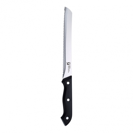 Juego de cuchillos 7 piezas. acero inoxidable. cuchillo de chef 33,3 x 3,3 x 1,5 cm. cuchillo de pan 32,6 x 3,3 x 1,5 cm. cuchillo de deshuesar 25,2 x 2,3 x 1,3 cm. cuchillo multiusos 23,6 x 2.3 x 1,3 cm. cuchillo de pelar 18,8 x 2,3 x 1,3 cm tijeras 21,4 cm x 7,77 x 1,2 cm. bloque de madera 6,1 x 10,5 x 20,7 cm