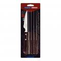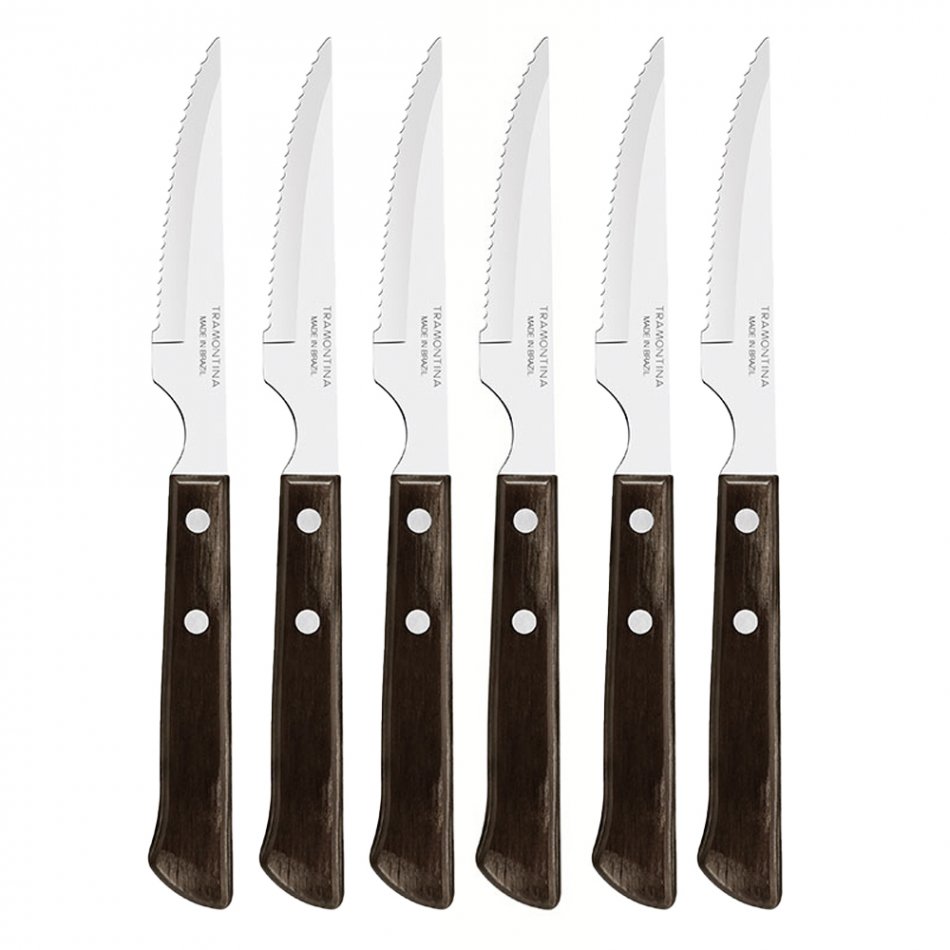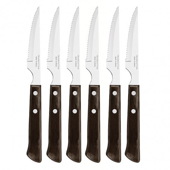 Juego de cuchillos de asado 6 piezas polywood castaño 10,16cm tramontina. juego de cuchillos 4" para asado tramontina, de acero inoxidable con mangos castaños, de madera, polywood, 6 piezas. los mangos de madera tratada son resistentes a impactos y altas temperaturas antes del primer uso, lave bien las piezas y séquelas. para mayor durabilidad de los cubiertos, se recomienda secarlos bien antes de guardarlos, incluso después de haber sido lavados en lavavajillas. incluye: 6 cuchillos 4" para asado