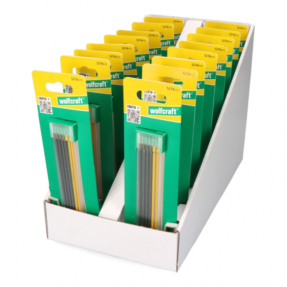 Con las seis minas de repuesto, estará equipado para un uso sostenible a largo plazo de los marcadores de agujeros profundos (p. ej., n.º ref. wolfcraft 5215000). tienen un diámetro de ø 2,8 mm y una longitud de 120 mm. el paquete contiene cuatro minas universales grises para realizar marcas bien visibles en superficies claras así como dos minas universales amarillas para superficies oscuras. al finalizar, pueden eliminar fácilmente las marcas con un paño húmedo o una goma de borrar. en el estuche de protección transparente, puede transportar las minas protegidas contra la rotura y conservarlas de forma ordenada.
