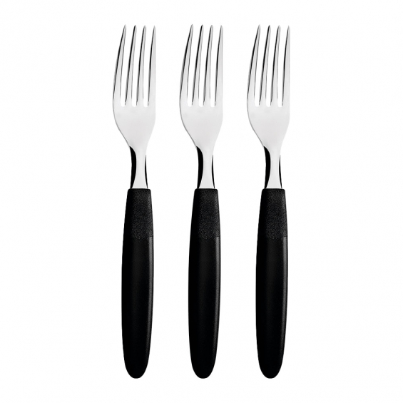 Juego de tenedores de mesa 3 piezas ipanema negro 19,1cm tramontina. juego de tenedores ipanema, en acero inoxidable, mangos de polipropileno, incluye 3 piezas, color negro. acero inoxidable: los cubiertos ipanema están elaborados con láminas de acero inoxidable, que tiene más durabilidad debido a su espesor y al estampado de las propias láminas. mangos de polipropileno: los cubiertos de este set tienen los mangos en color negro y están elaborados con polipropileno, que proporcionan una mayor resistencia y durabilidad.