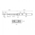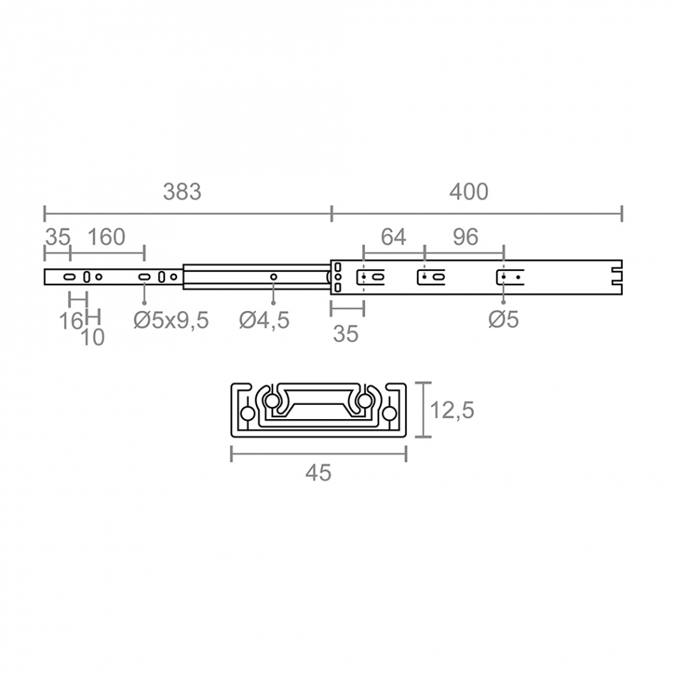 Juego de guia telescópica de cajón en acero 400mm. dimensiones: 45x12,5mm (ancho/alto). de extracción total con sistema de freno mediante amortiguador especial de goma. montaje del cajón mediante tornillos. carga máxima de 45kg. dispone de gatillo lateral para desmontaje. incluye codigo de barras individual. acabado zincado. micel