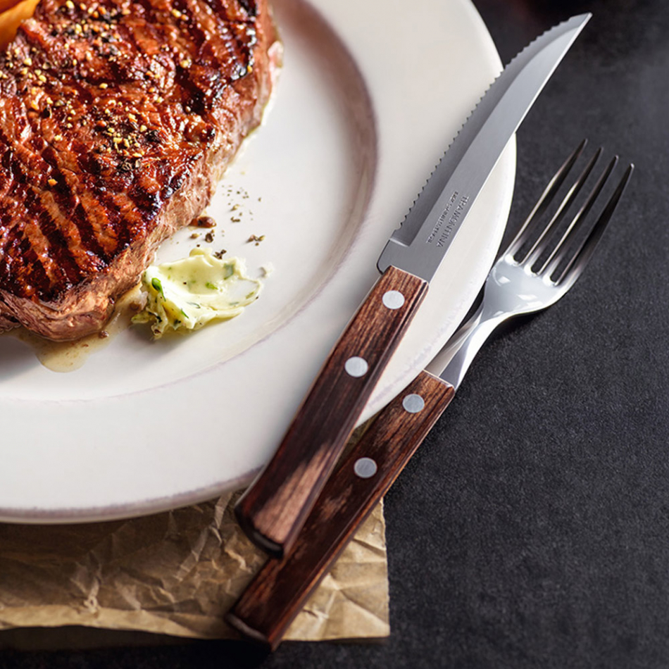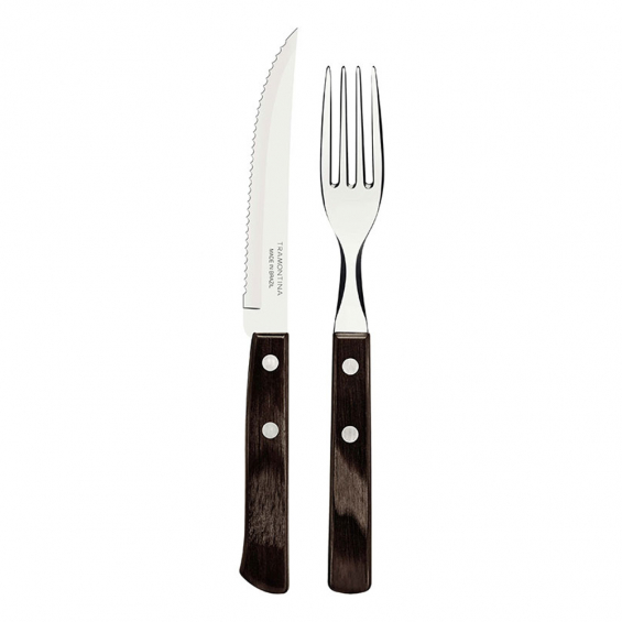 Juego para asado 12 piezas fsc polywood castaño tramontina. juego de cubiertos para asado tramontina, de acero inoxidable con mangos castaños, de madera, polywood, 12 piezas. láminas de acero inoxidable altamente durables. los mangos de madera tratada son resistentes a impactos y altas temperaturas antes del primer uso, lave bien las piezas y séquelas. para mayor durabilidad de los cubiertos, se recomienda secarlos bien antes de guardarlos, incluso después de haber sido lavados en lavavajillas. incluye: 6 tenedores de mesa y 6 cuchillos de asado 5"