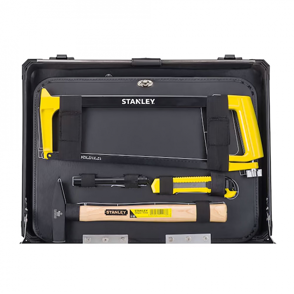 Kit de mantenimiento con maletín de aluminio 142 piezas stmt98109-1 stanley. maletín de aluminio. material ligero para facilitar el transporte, máxima durabilidad para todos lo tipos de entorno. interior inteligente. tres paneles interiores equipados con elásticos para sujetar las herramientas, sistema de bloqueo del panel pleglable y base con espuma bicolor recortada. cierres metálicos y asa de transporte de alta durabilidad.