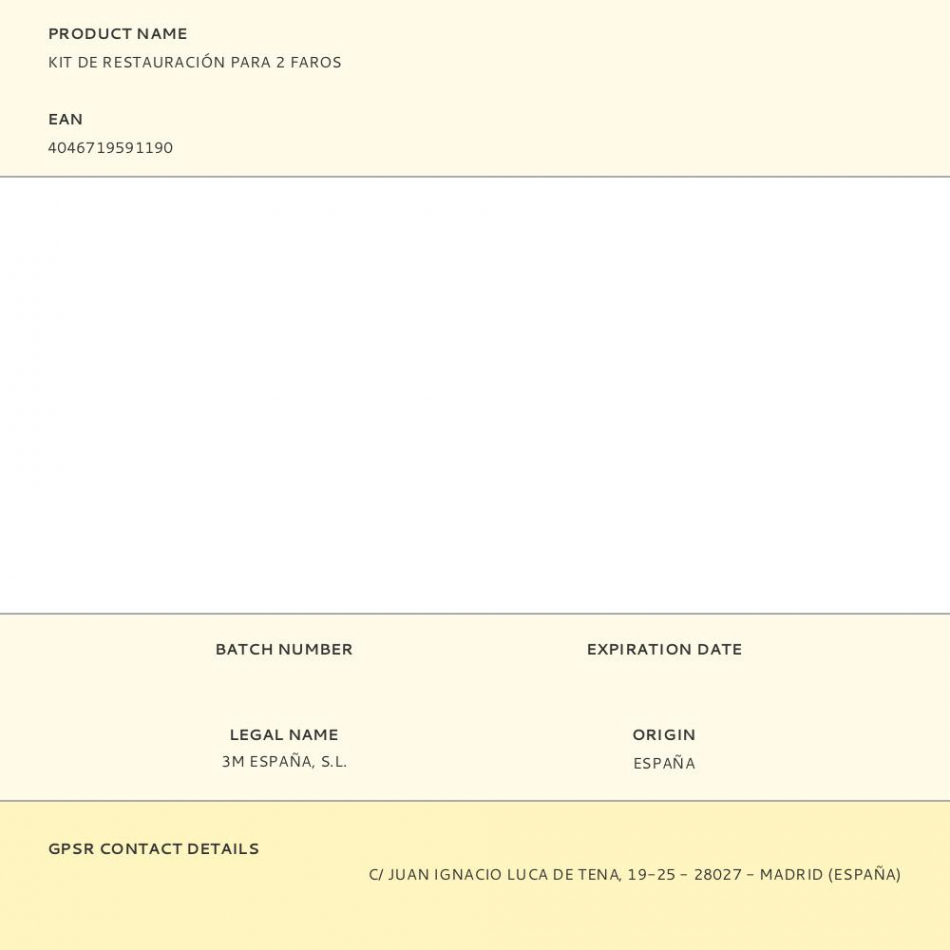 Kit de restauración para 2 faros, elimina los arañazos y defecto de los faros, mejora la visibilidad y es facil de usar, 3m39073. contiene: cinta de carrocero, 6 lijas p500 ø75 mm, 4 lijas p800 ø75 mm, 1 lija p3000 ø75 mm, 1 plato con velcro para taladro ø75 mm, 1 esponja de pulido ø75 mm y 1 sobre de compuesto pulidor 29,5 ml