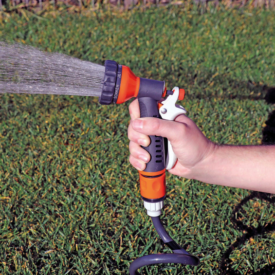 Kit de manguera espiral "riega fácil" extensible longitud total 15m. ø exterior 9mm (3/8"). incluye conexiones rápidas 1 adaptador para grifo rosca 1/2"-3/4". pistola con 7 modos ajustables de pulverización. presión máxima 8 bar. ideal para terrazas, balcones y jardín. fácil de enrollar y guardar para ahorrar espacio