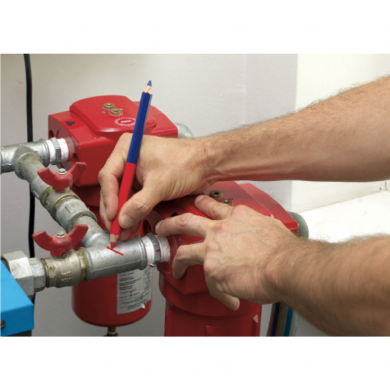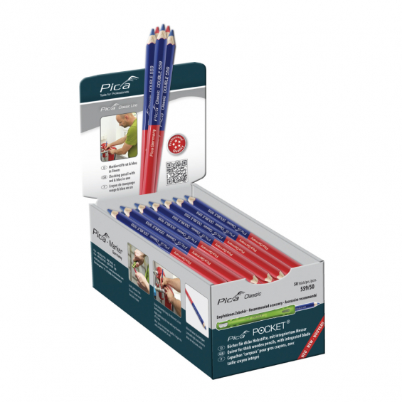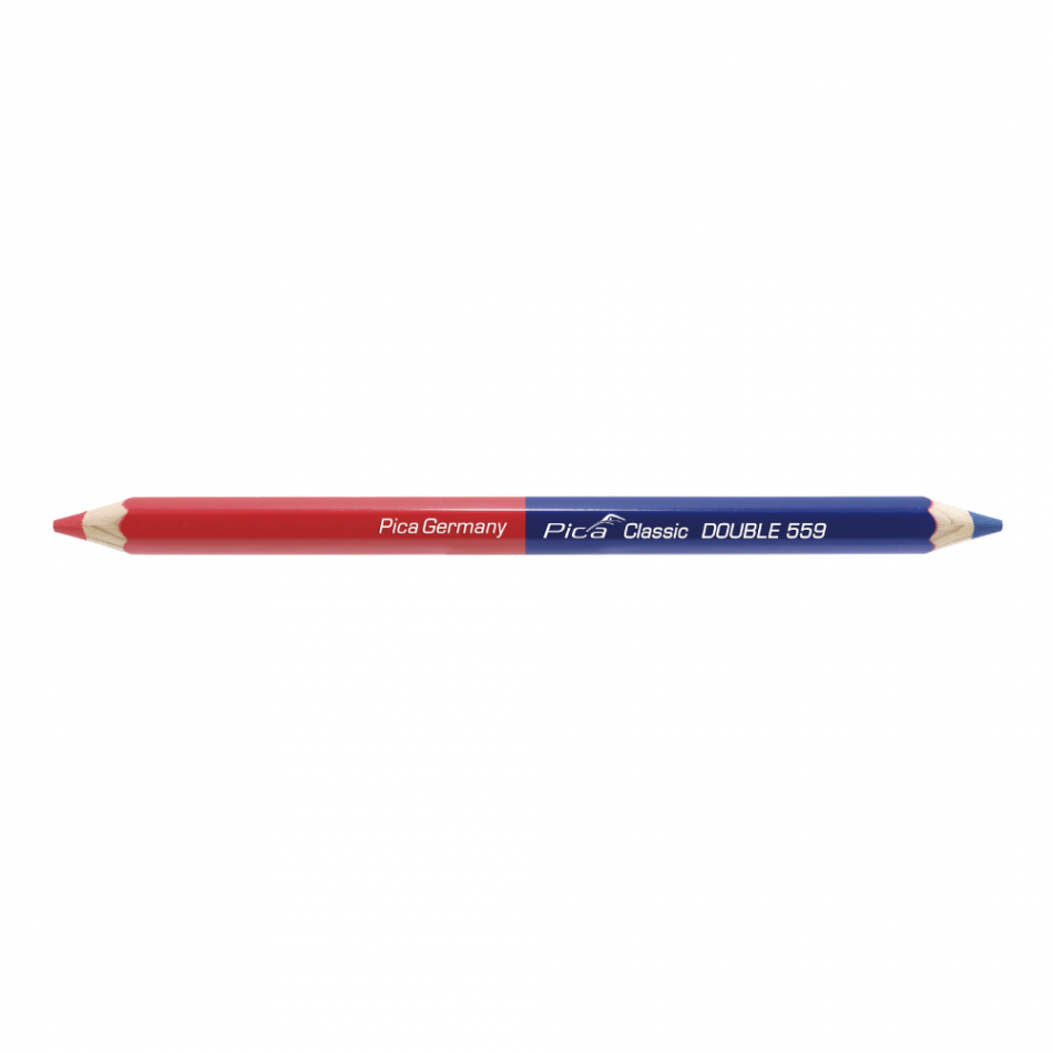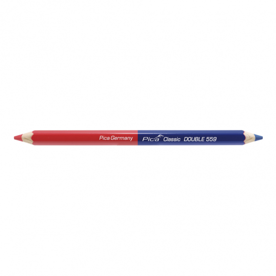 Lápiz de doble punta roja y azul con perfil hexagonal. madera fácil de afilar procedente de bosques de cultivo sostenible. minas de alta calidad de gran diámetro. afilado en ambos lados