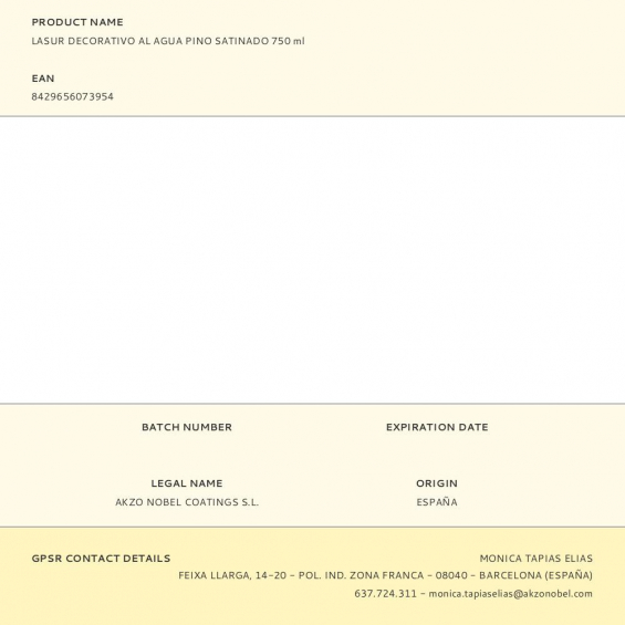 Protector decorativo satinado pino 750 ml al agua es un lasur de dispersión acuosa de copolímero acrílico para proteger la madera del agua y a la intemperie y protector hidrofugante, para el cuidado de muebles y maderas en exterior. no recomendado para superficies que vayan a estar sometidas a grandes esfuerzos de abrasión, rendimiento aproximado 13-18 m²/l, secado en 30 min repintado 2 h
