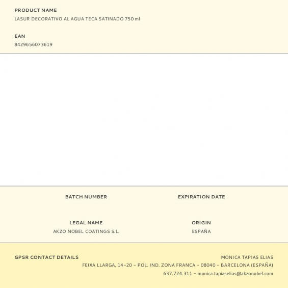 Protector decorativo satinado teca 750 ml al agua es un lasur de dispersión acuosa de copolímero acrílico para proteger la madera del agua y a la intemperie y protector hidrofugante, para el cuidado de muebles y maderas en exterior. no recomendado para superficies que vayan a estar sometidas a grandes esfuerzos de abrasión, rendimiento aproximado 13-18 m²/l, secado en 30 min repintado 2 h