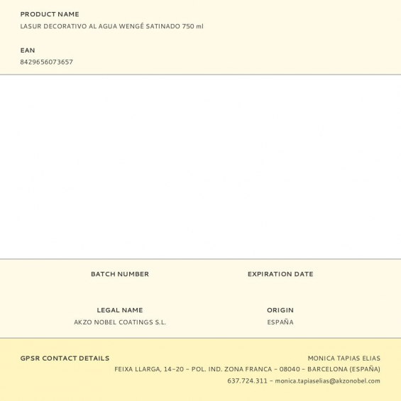 Protector decorativo satinado wengé 750 ml al agua es un lasur de dispersión acuosa de copolímero acrílico para proteger la madera del agua y a la intemperie y protector hidrofugante, para el cuidado de muebles y maderas en exterior. no recomendado para superficies que vayan a estar sometidas a grandes esfuerzos de abrasión, rendimiento aproximado 13-18 m²/l, secado en 30 min repintado 2 h