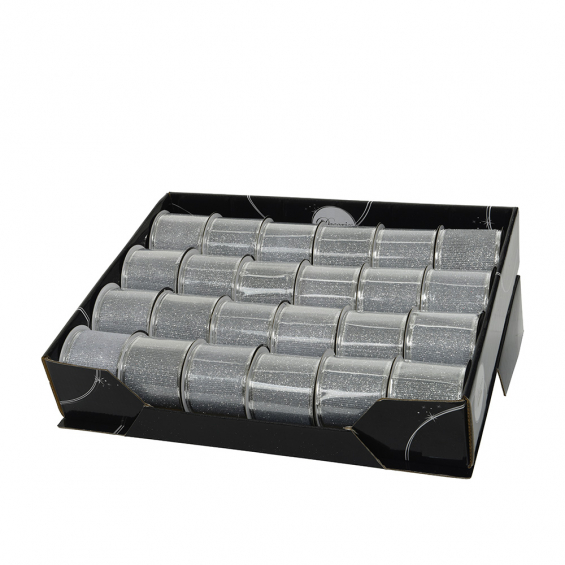 Lazo con purpurina plata 6,3x270cm. expositor 24 unid.