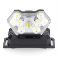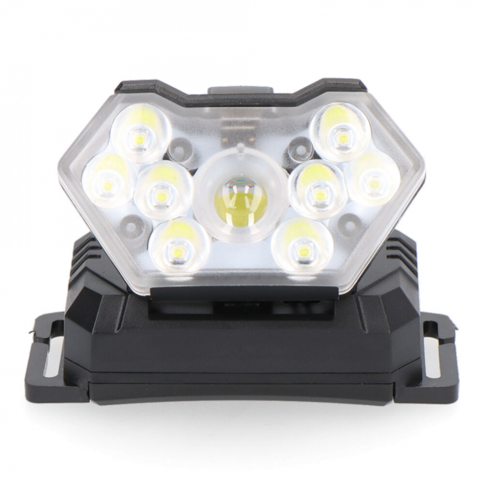 Linterna de cabeza con inclinación ajustable 60°, spot led 5w, 6500k, 3 modos: 400lm/100lm/flash. smd led 8x1w 9000k 2 modos: 200lm/400lm (spot+smd). funcion emergencia presionando 2 segundos. funciona con 3 pilas aaa no incluidas, hasta 8h de autonomía, ip30,