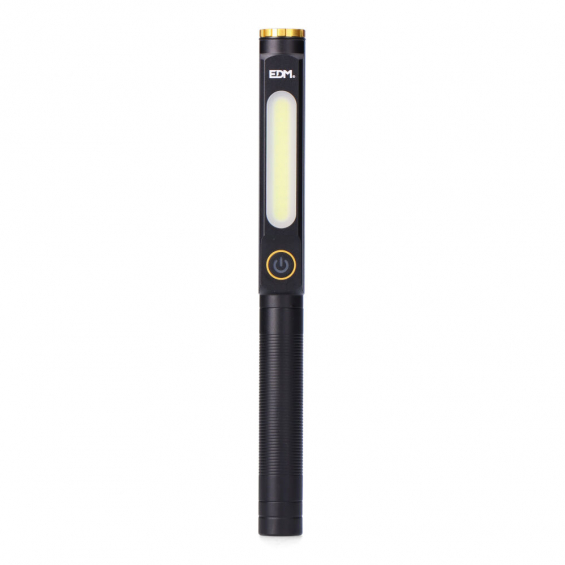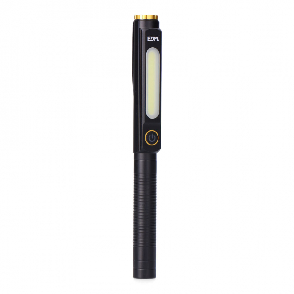 Linterna de trabajo de aluminio, ip44. spot led 5 w, 6500 k, 200 lm. cob led 8 w, 6500 k con 3 modelos: 500 lm / luz roja / flash rojo. regulable la intensidad spot/cob 30% - 100%. bateria 750mah de litio (incluida), cable usb tipo c (incluido). hasta 3 h de autonomia aprox, carga de 3 h. con iman en la base y clip. medida 18,5 x 25 x 204 mm. presentacion en expositor de 25 unidades
