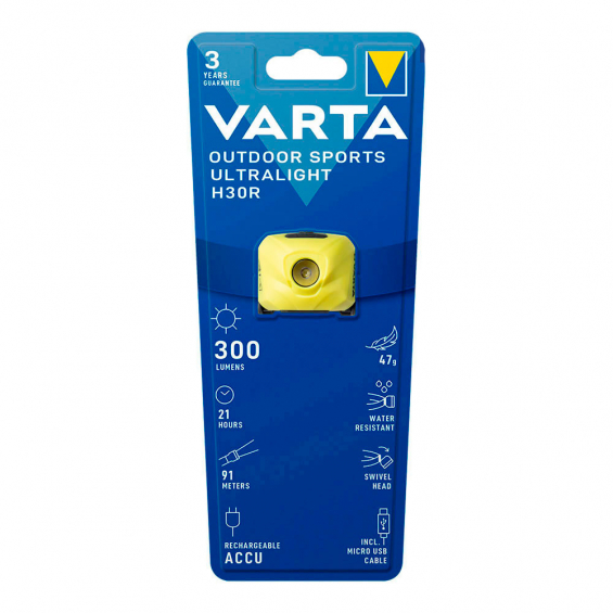 Linterna frontal ultralight h30r amarilla varta 3w, 300lm, duracion hasta 21h, rango del foco hasta 91m. linterna frontal extremadamente ligera, incluye bateria recargable, cabezal giratorio para iluminacion optima, funcion de atenuacion para una intensidad de luz ajustable, resistente agua ipx4 y a prueba de golpes, luz indicadora de carga, cinta para cabeza ajustable y lavable. incluye cable micro usb. longitud 4,02cm