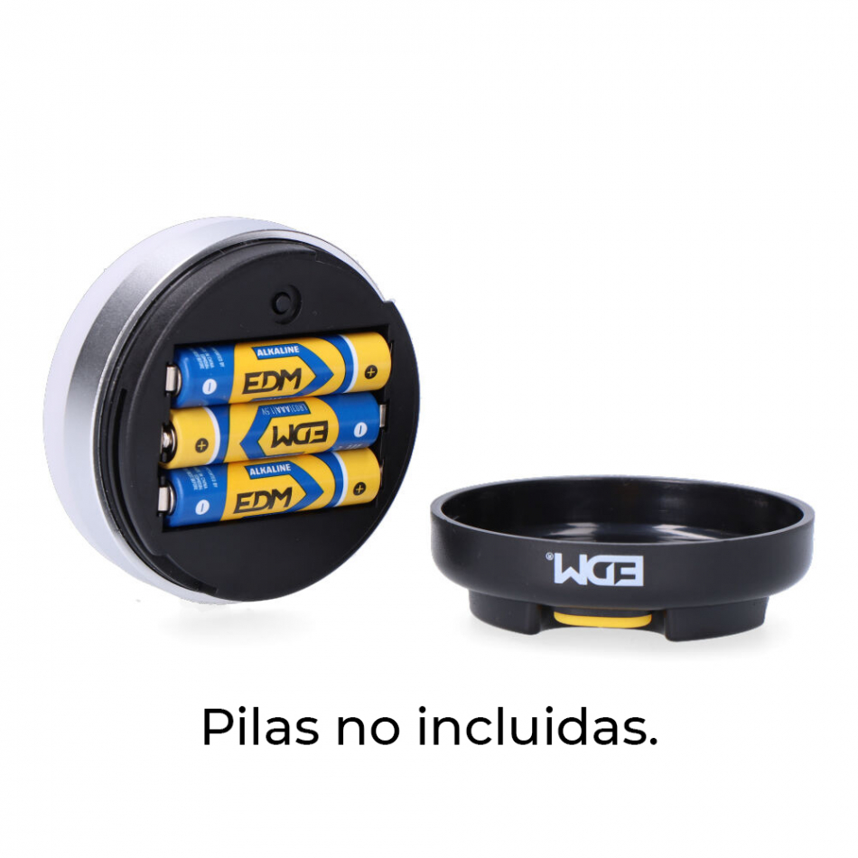 Linterna imantada led 260 lm 3 w. temperatura de la luz 3cct: 6500 / 7000 / 2900 k. protección: ip44. incluye batería recargable 1100 mah y cable de carga usb-c (posibilidad de usar 3 x aaa no incluidas), con función de aplique. 6 modos de luz: aplique "high" 260 lm, linterna luz fría "high" 250 lm, aplique "low" 130 lm, linterna luz cálida "high" 130 lm, linterna luz fría 125 lm y linterna luz cálida "low" 65 lm. medidas: ø 66 x 40 mm. apertura giratoria. presentada en expositor de 12 unidades
