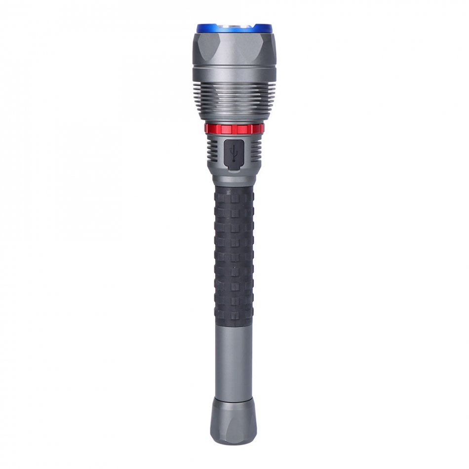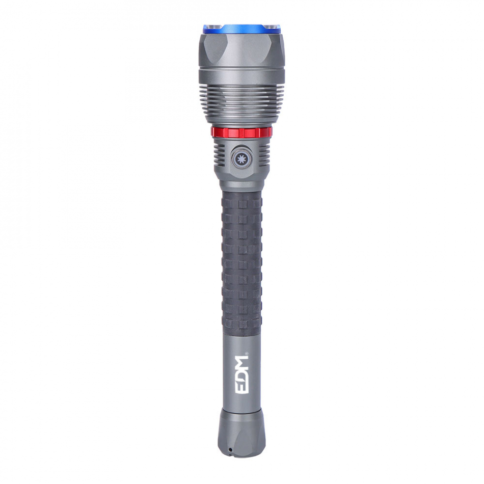 Linterna led 18.000lm edm hasta 20h de autonomía, características: 180w lled 6500k 5 modos: turbo (30s) 18000lm/10000lm/5000lm/800lm/ luz estroboscópia (flash), con función de power bank, impermeable ip67, bateria 3x5000 mah de litio incluida, material aluminio, carga en 9h, con indicador de batería. incluye: cordón, cable usb tipo c, funda para cinturón, manual de usuario. presentada en expositor de 4 uds