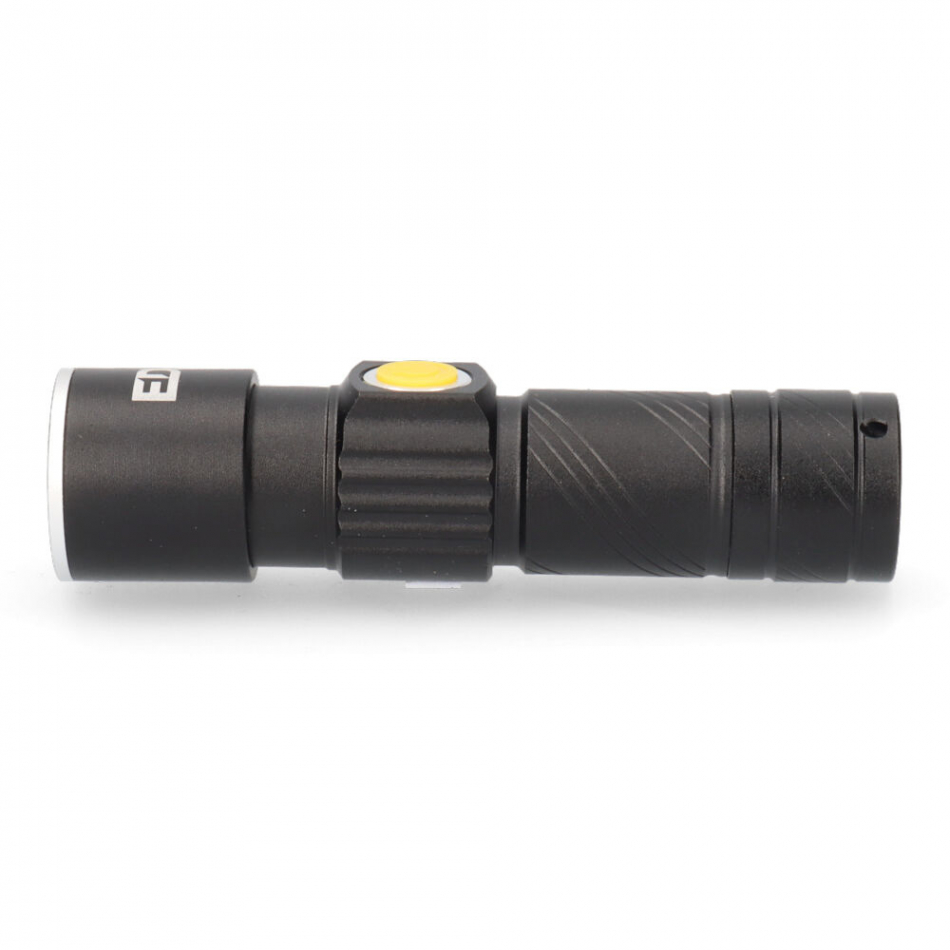 Mini linterna con zoom 1 led 3w 9.000k recargable con usb. bateria 350mah de litio incluida (carga en 2 horas). color negro. luminosidad 3 modos: 120lm/40lm/ flash. material: aluminio. medida: ø2,6x9,5cm . resistencia a salpicaduras. ip44. presentado en expositor de 12 unidades