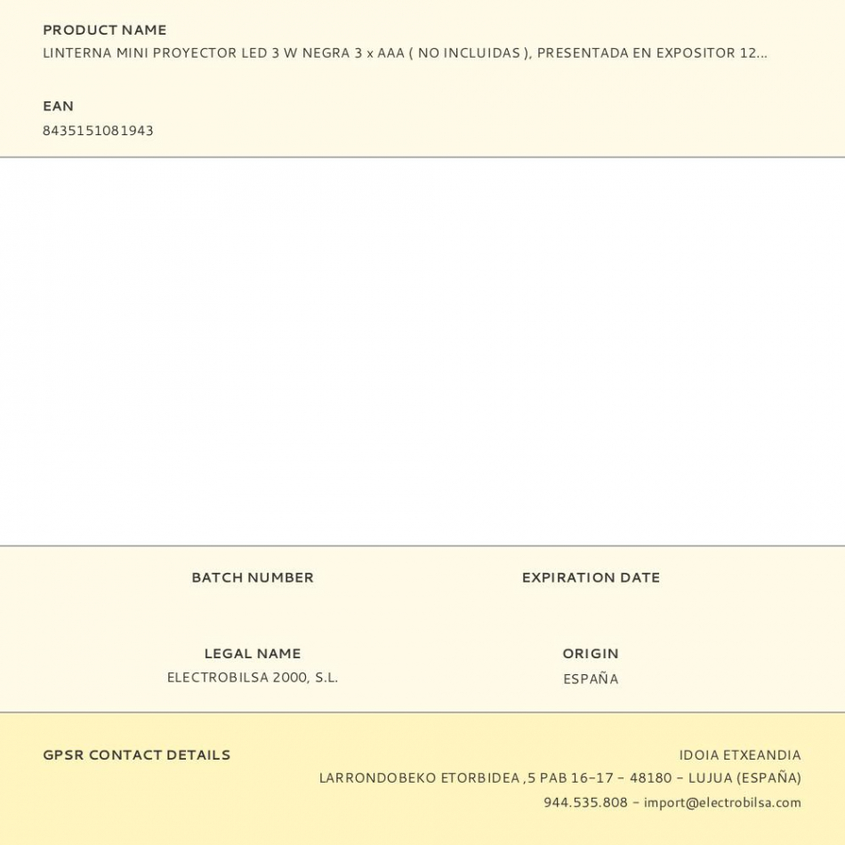 Linterna mini proyector led 3 w negra 3 x aaa ( no incluidas ), presentada en expositor 12 uds