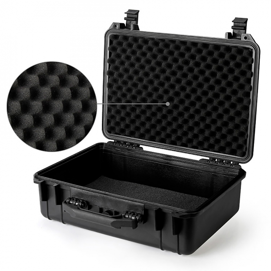 Maleta estanca antichoque 46,5x36x17,5cm. hecho de plástico de ultra alto impacto. resistente al agua y a los golpes, aplastamientos, polvo, etc, espuma interior recortable. workpro