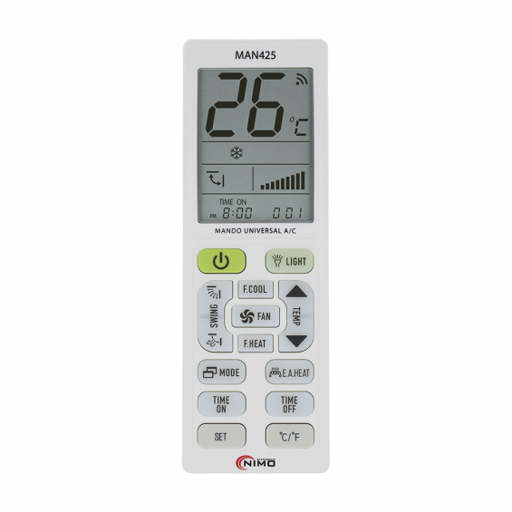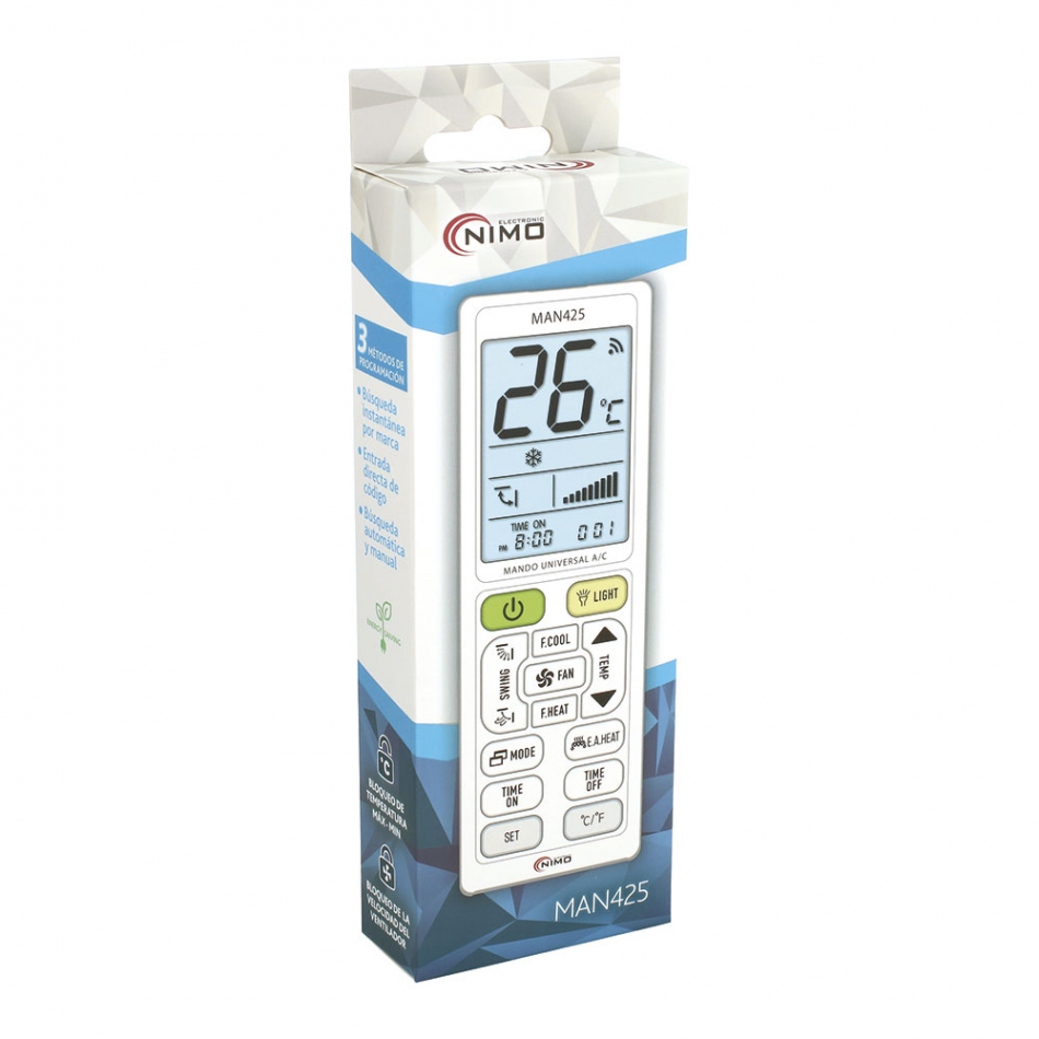 Mando universal para aire acondicionado con 5000 códigos. válido para todas las marcas, opción eco, bloqueo de temperatura máx.-min. función de temporizador, termómetro, reloj, linterna, pantalla iluminada, 3 métodos de programación: búsqueda instantánea por marca, entrada directa de código o búsqueda automática y manual. alimentación pilas 2xaaa (no incluidas).