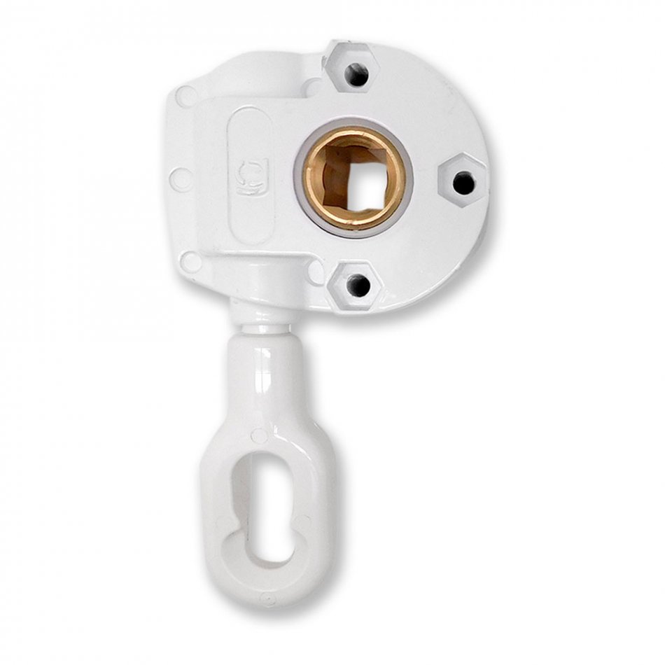 Para enrollar el toldo. con cada 7 vueltas a la manivela 1 vuelta al eje. permite abrir y cerrar los toldos mediante la manivela tld06. ideal para toldo recto. agujero cuadrado interior de 14mm. material zamak. acabado blanco. dimensiones 77x35x135mm.