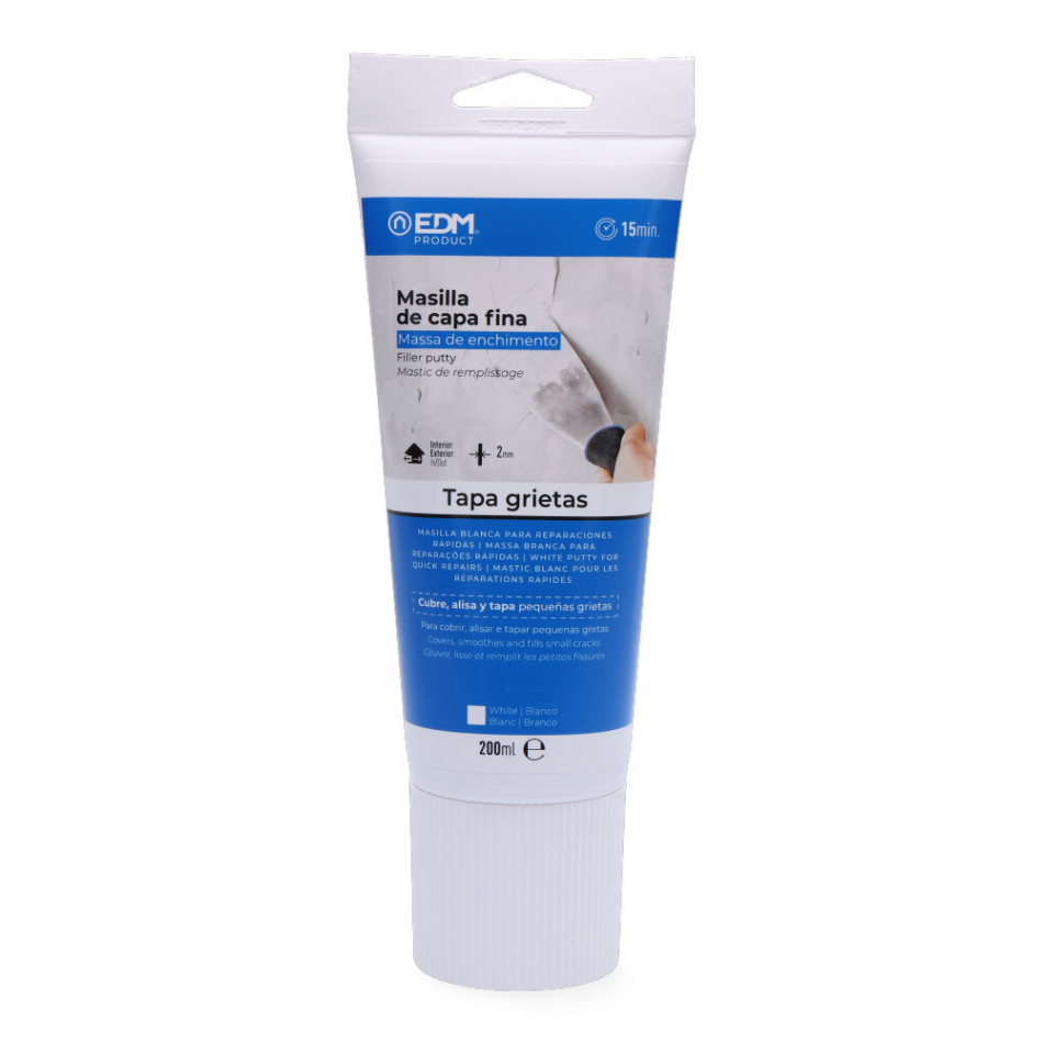 Masilla de capa fina 200ml edm. tapa grietas para reparaciones rápidas. pasta de secado rápido para la reparación de pequeñas fisuras, grietas y agujeros de clavos, sobre paredes y techos. aplicar sobre soportes limpios y sanos. lijar y pintar tras el secado completo. contiene bit, cmit/mit como conservantes. puede provocar una reacción alergica. tiempo de trabajo: sin limites. se puede trabajar (lijar, pintar) casi inmediatamente, en 10-15 min.