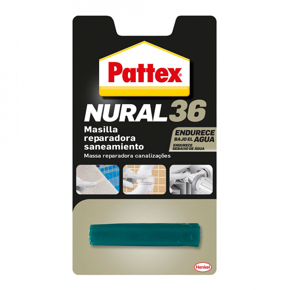 Masilla reparadora saneadora pattex nural 36 para restaurar y reparar todo tipo de materiales de obra y conducciones metálicas o de pvc que se adhiere sobre superfícies húmedas y endurece incluso bajo del agua. tiempo de mezcla: se dispone de 10min.para mezclar y aplicar el producto.tiempo de manipulación: 1hora, tiempo de edurecimiento: 12horas, resistencia a tracción por cizalla (según norma en1465): 60kg/cm² (48horas, 23°c, acero), resistencia a la temperatura: desde -30°c hasta +150°c, resistente al agua, al aceite y a los disolventes usuales, no contiene disolventes y no altera su volumen al endurecer, color blanco, 48gr