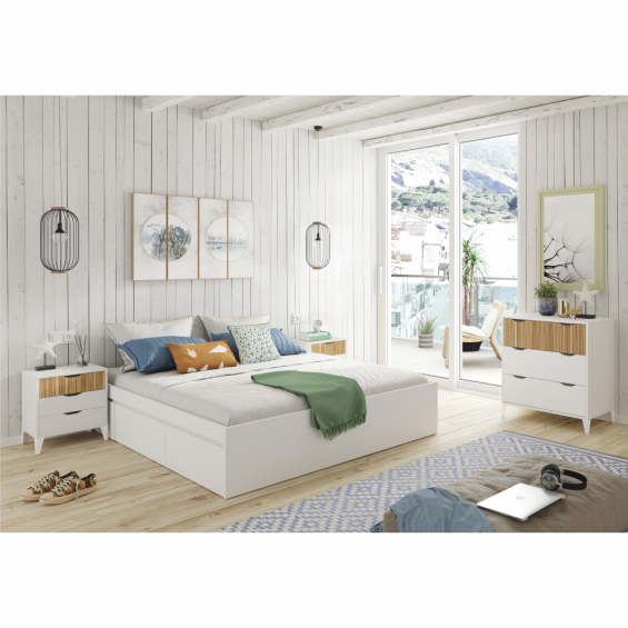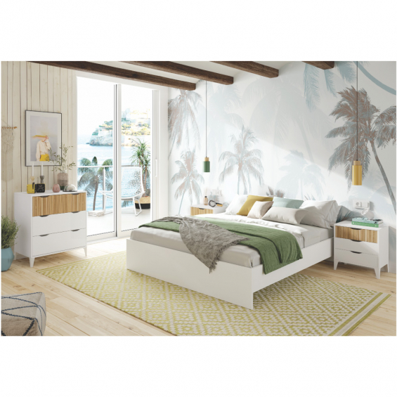 Mesita de noche con 3 cajones. color blanco + natural. material: melamina. contiene: correderas no extraibles de metal patas abs 10 cm alto de los cajones 12 cm peso soportado por cada cajón 5 kg peso maximo soportado total 15 kg. medidas: 40 x 33 x 50 cm