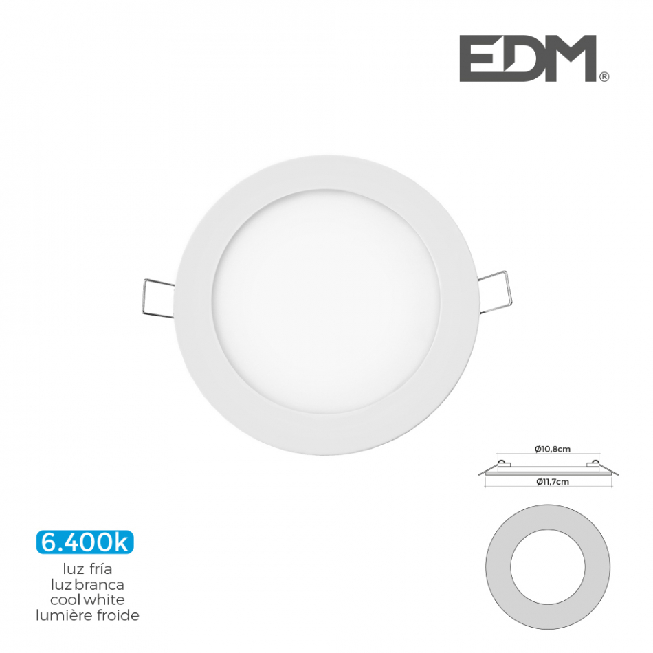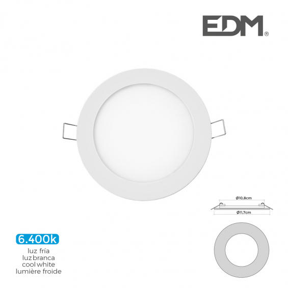 Mini downlight led empotrable redondo 6w 6400k luz fria 320lm. color blanco. angulo de apertura: 120°. ip20. clase energetica g. medidas: exterior: ø11,7cm - enclavamiento: ø10,8cm 220-240v 25.000h