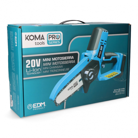Mini motosierra 20 v, con botón de desbloqueo, tensado sin herramientas, longitud de espada 4(101mm), con 26 eslabones. velocidad en relentí 4,8m/s, nivel de presión sonora lpa, 78db(a), k3db(a). vibración 3,425m/s2,k1,5m/s2, velocidad 3200 rpm. sin deposito interior de aceite. bateria no incluida. 20v-mms. medidas: 35,5 x 8,3 x 23 cm