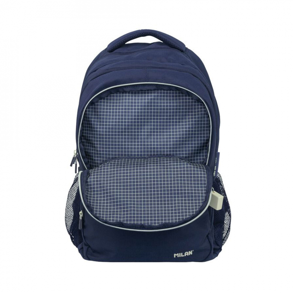 Mochila escolar con 4 cremalleras (25 l) serie 1918, azul marino milan. mochila escolar con 4 cremalleras. serie 1918, color azul marino. un bolsillo principal con compartimento interior protector para portátil. 3 bolsillos delanteros. 2 bolsillos laterales de malla de fácil acceso. asas regulables, parte posterior acolchada y transpirable, base reforzada. permite añadir un carrito porta-mochilas. el bolsillo delantero incluye un llavero de la goma 430 en el tirador de la cremallera. forro interior estampado azul marino con una cuadrícula que evoca las formas de las gomas milan. tejido exterior 'ripstop': ligero y resistente a la rotura y rasgaduras. utiliza una técnica especial que teje hilos gruesos de refuerzo a intervalos regulares en un patrón entrecruzado. composición tejido: exterior y forro interior de poliéster. medidas: 46,5x30x17cm. capacidad: 25 litros.