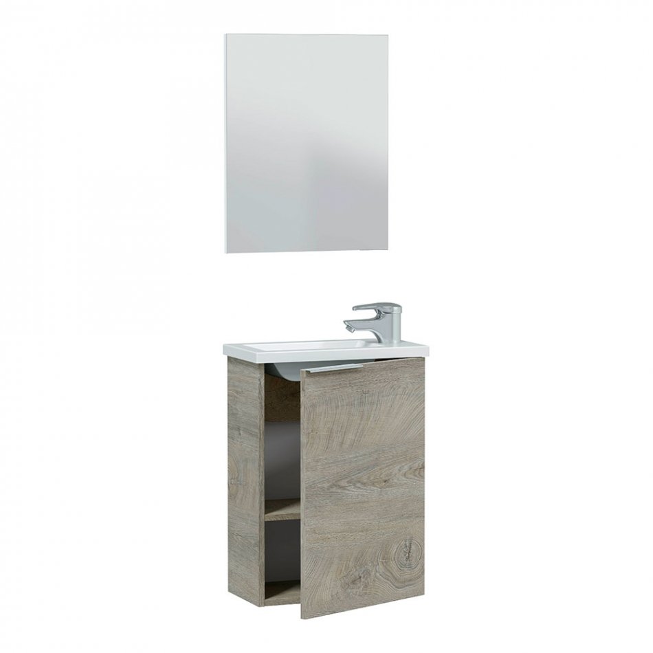 Mueble para baño compact acabado en color roble alaska. modelo para aseos pequeños y estrechos gracias a su poca profundidad. diseño fácil y práctico fabricado en melamina de alta calidad, incluye lavabo de resina y espejo. el armario inferior tiene un estante regulable en altura y bisagras con cierre progresivo soft closet. además, la puerta se puede montar con apertura a un lado y al otro. incluye los dispositivos de fijación del mueble a la pared. medidas mueble lavabo: alto 58 cm ancho 40 cm profundo 22 cm espejo: alto 50 cm ancho 40 cm profundo 1'8 cm lavabo: alto 2'5 cm ancho 40 cm profundo 22 cm. (grifería, sifón y válvula no incluidos) servicio de postventa gratuito: postventa@fores-group.com