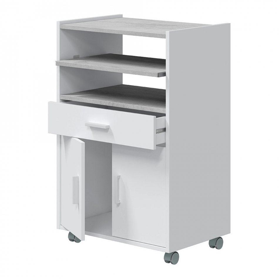 Mueble auxiliar de cocina con ruedas para microondas, bandeja extraíble en la parte superior, un cajón en parte central y 2 puertas abatibles en la parte inferior. acabado en blanco artik (mate) combinado con gris cemento.medidas del mueble auxiliar de cocina para microondas: 92 cm (alto) x 59 cm (ancho) x 40 cm (fondo). medidas del cajón: 53 cm (ancho) x 10 cm (alto) x 35 cm (fondo). servicio de postventa gratuito: postventa@fores-group.com