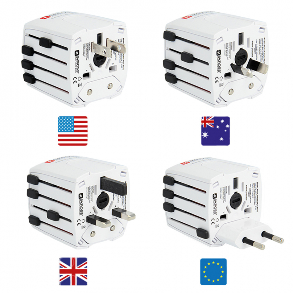 Multi adaptador de viaje skross 1302180. 100v-250v. diseñado en suiza, ideal para aparatos sin toma de tierra, entrada: europa, australia/china, reino unido, estados unidos/japón. salida: europa, australia/china, reino unido, estados unidos/japón. voltaje de entrada: 100v-250v. máx carga 2,5a. 100v-250w 250v-625w, fusible reemplazable, no convierte el voltaje.