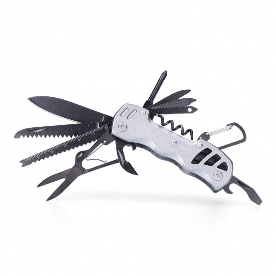 Multiherramienta modelo plateado, con mango de aluminio, hoja de acero inoxidable 420, incluye estuche de nylon y enganche para cinturon, consta de 12 herramientas: navaja, sierra, limpiador de escamas de pescado, tijeras, abrelatas, abrebotellas, sacacorchos, destornillador philips, enhebrador, perforador de cuero, lima de uñas y mosquetón, serie k2. edm