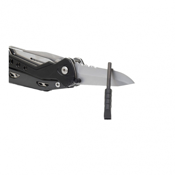 Multiherramienta outdoor para supervivencia de emergencia. acceso al cuchillo con una sola mano, todas las demás herramientas encajan dentro del marco ergonómico estilo esqueleto. incluye varilla de ferrocerio con un silbato de emergencia. navaja parcialmente dentada de 70 mm con perno para el pulgar alicates de punta de aguja con cortadores de carburo/pelacables, con resorte. sierra de corte de dientes de tiburón de 50 mm, triple punta endurecida + lima doble cara, corte de diamante abridor de botellas un destornillador plano grande, 1 phillips bolsa de transporte de nailon con presilla para cinturón