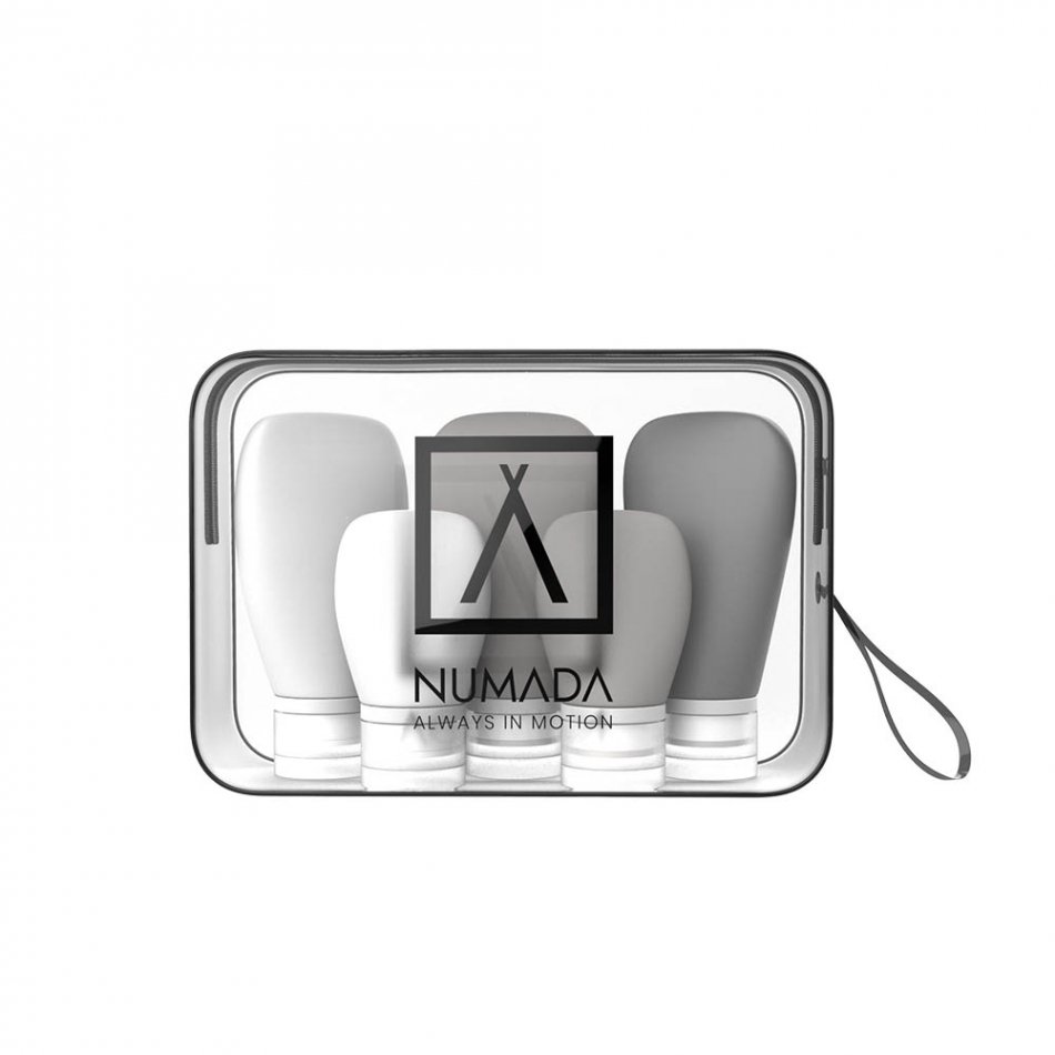 Neceser transparente de pvc con cremallera gruesa con cinta y gran apertura de llenado. fácil de limpiar. material impermeable. contiene 5 botellas de silicona rellenables. botes libres de bpa