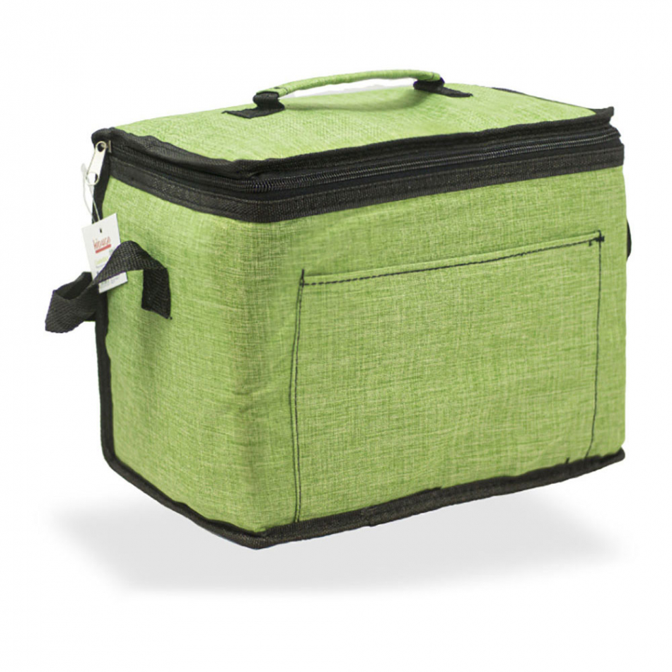 Nevera diseño tejana, color verde, 10 l. con bolsillo frontal, asa y correa ajustable, con aislamiento de capa de alu film y plástico protector, revestimiento con isotérmico epe de 5 mm. medidas: 28 x 22 x 16 cm