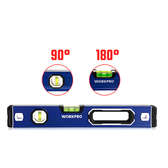 Nivel de burbuja con base mágnetica 40cm pro. contera a prueba de golpes. anillo de agarre grande, cómodo de usar. aleación de aluminio con tratamiento de oxidación duradero. precisión: 0,5mm/1m, 2 viales (/90°/180°). la ranura en forma de v es adecuada para superficies redondas y de tuberías. con agujero para colgar. azul. workpro