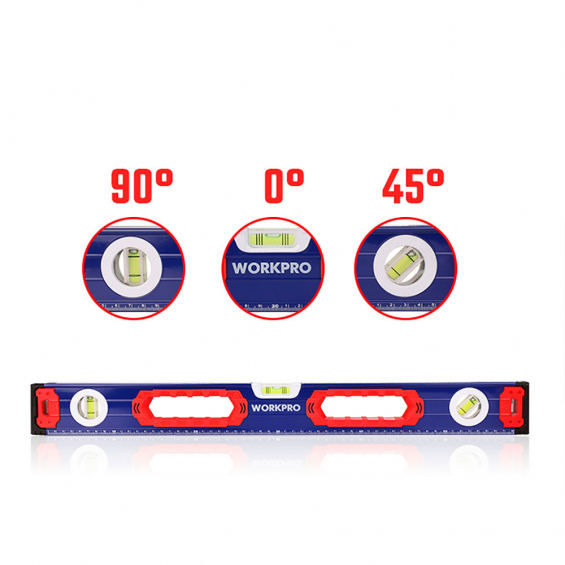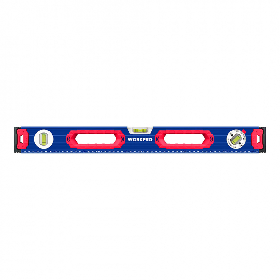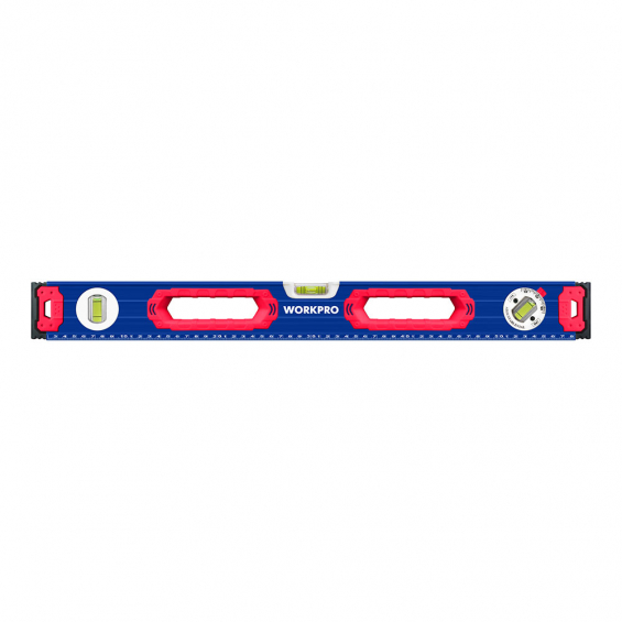 Nivel de burbuja con base mágnetica 60cm. contera a prueba de golpes. marco de aleación de aluminio. anillo de agarre grande, cómodo de usar. precisión 1mm/1m, 3 viales. (45°/90°/180°). con escalas, más fácil de leer. base magnética. azul y rojo. 600 x 65 x 25 mm. workpro