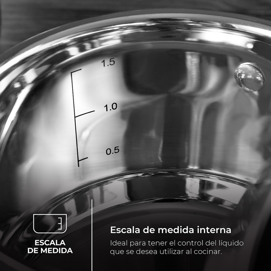 Olla ø28x16,5cm 9,5l de acero inoxidable con tapa foodies bgmp-1506-bk masterpro. la olla tiene unas medidas de ø28x16,5cm. su capacidad es de 9,5l. está hecha de acero inoxidable. la cacerola es apta para la inducción. las asas están recubiertas de silicona negra. los acabados son brillante y mate. el borde de la tapa es de color negro.la cacerola está fabricada con acero inoxidable 18/10, que proporciona al producto una gran resistencia tanto al desgaste como a la corrosión. la olla viene con una tapa de vidrio extrarresistente. la cacerola cuenta con dos filtros de diferentes tamaños. según la situación, los filtros se podrán cambiar para hacer los respectivos ajustes. la tapa transparente muestra todo lo que sucede durante el proceso de cocinar.la olla cuenta con una escala medidora que evitará las molestas pérdidas de tiempo en la búsqueda de un medidor. además, el pico de vertido de la cacerola es muy conveniente y le dará aún más control a quien la maneja. las tapas de vidrio incluyen un evacuador de agua. esta olla es apta para su utilización en cualquier tipo de fuego o fuente de energía, incluida la inducción de 360º.