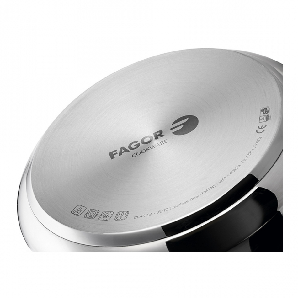 Olla clasica bombeada 4l inoxidable 18/10 fagor. nivel de presión: rápido (55kpa). 3 sistemas de seguridad y cierre progresivo con puente de seguridad. fondo termodifusor impaksteel de máxima resistencia que optimiza la conductividad térmica. asas ergonomicas de baquelita termoaislante. ø23,5x12cm (diámetro/alto)