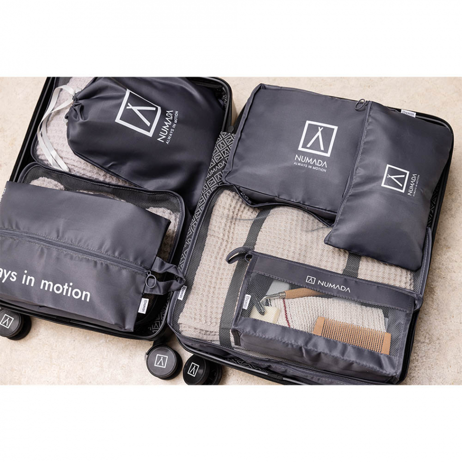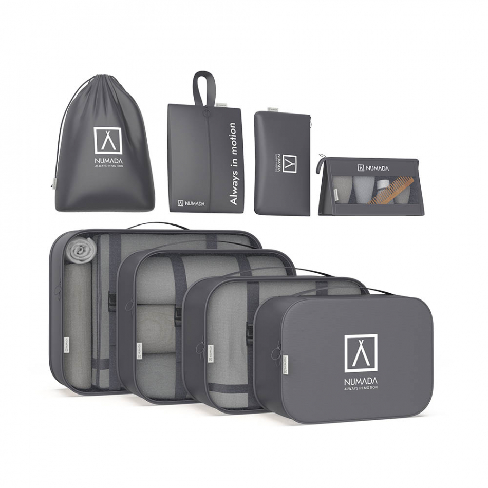 Set de 8 organizadores de maleta para ahorrar espacio. caracteristicas: material impermeable, multiusos y ligeros, con cremallera de doble cursor y rejilla de visibilidad. color: gris oscuro