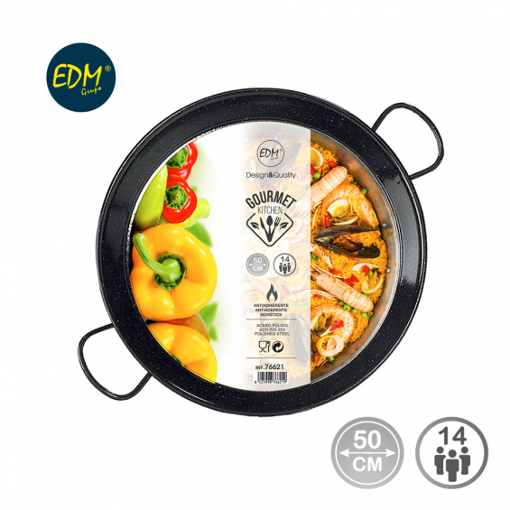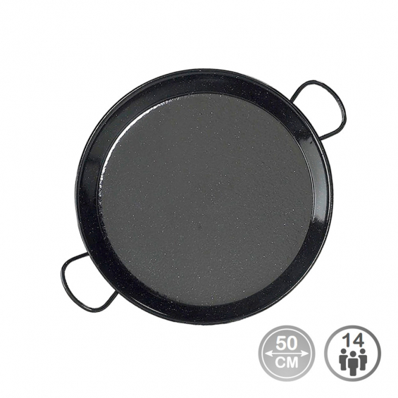 Paellera tradicional de acero esmaltado ø50cm (14 personas) apta para cocinas de gas. fabricacion nacional. atención: requiere mantenimiento. debe ser almacenado con una cubierta de aceite. vaello