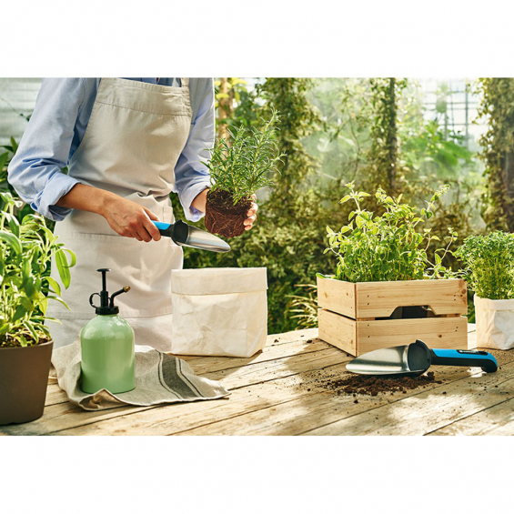 Paleta de trasplante para trabajos de precisión, fabricada en acero inoxidable de primera calidad y mango composite de fibra de vidrio con sistema safe touch, para mayor confort.