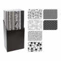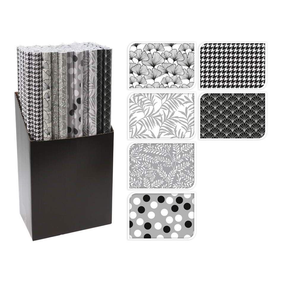Papel de regalo con motivos blancos, negros y grises, 70 x 200 cm, ø28 mm, 56-57 gramos, 6 modelos surtidos, rollos envasados en display negro