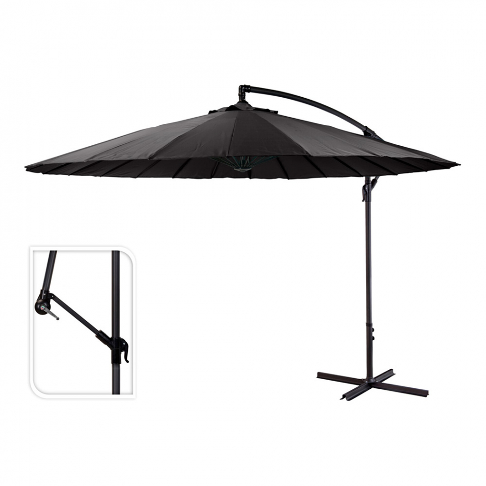 Parasol excéntrico color antracita con manivela, 180 gr / m², no incluye base. cuerpo de acero con recubrimiento de poliamida y tela de poliéster. dimensiones: altura máxima 3 m / ø 300 cm. tubo principal de acero 48 x 1,2 mm / tubo transversal 42 x 1,0 mm, 24 varillas de fibra de vidrio de 7 mm (recubiertas de polietileno negro)