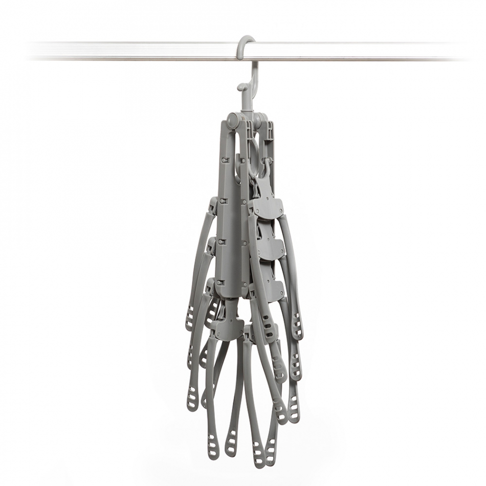 Colgador de ropa múltiple gris, 8 perchas unidas. puede colocarse en varias posiciones (horizontal o vertical). los brazos de cada percha se pliegan para colgar y descolgar las prendas con mayor facilidad. gancho colgador giratorio 360°. no apto para abrigos o prendas pesadas. incluye instrucciones de montaje. medidas desplegado: 41 x 13 x 52 cm (h) 41 x 16 x 5 cm (v).