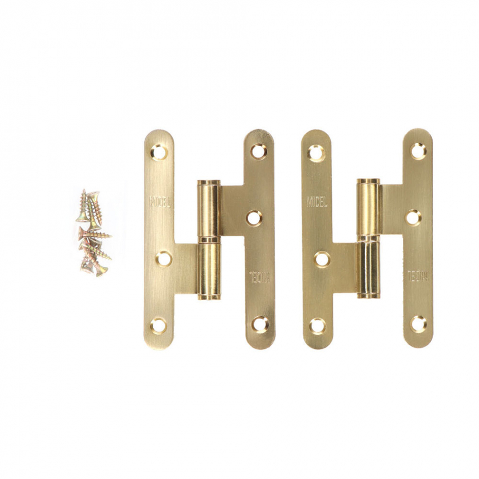 Pernio en acero sin remate y canto redondo de mano izquierda de 100x58mm. espesor 2mm. incluye tornillos. acabado latón satinado